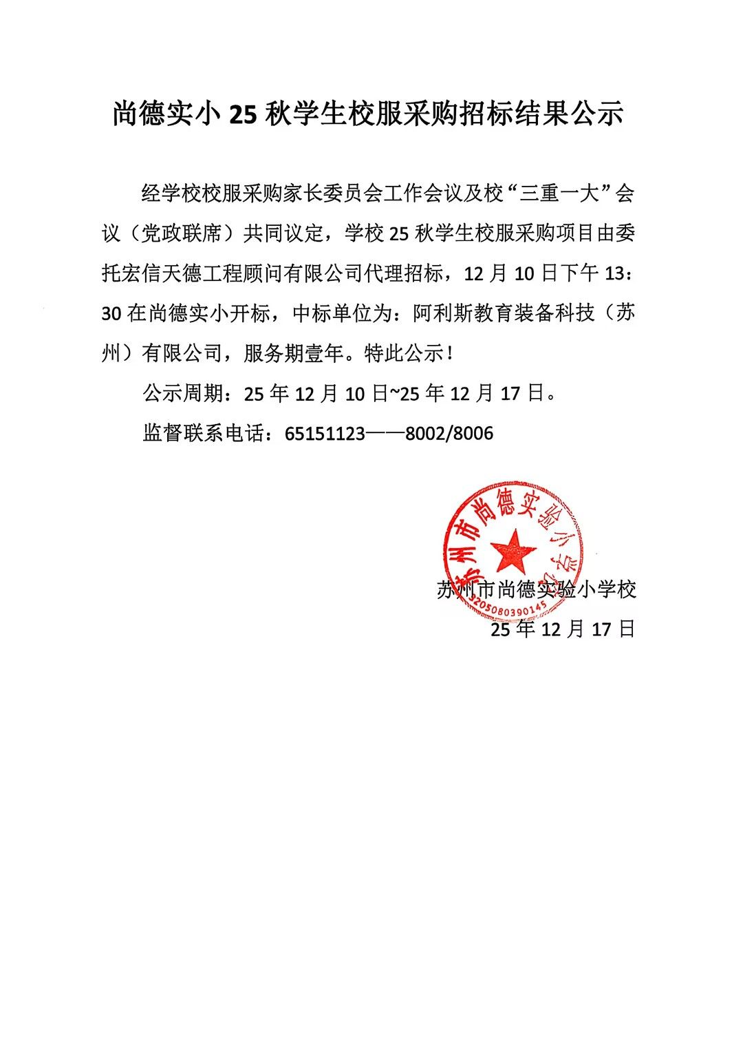 尚德实小 25 秋学生校服采购招标结果公示